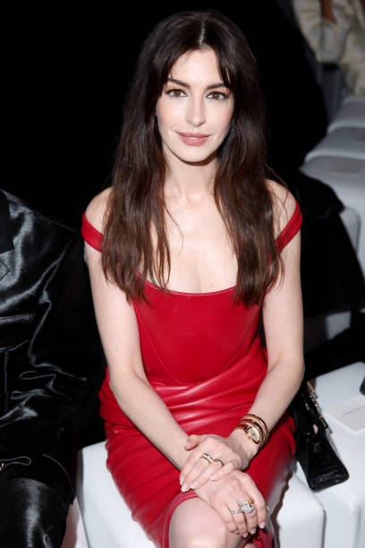 MILAN, ITALY – FEBRUARY 23: Anne Hathaway attends the Versace fashion show during the Milan Fashion Week Womenswear Fall/Winter 2024-2025 on February 23, 2024 in Milan, Italy. (Photo by Daniele Venturelli/WireImage)