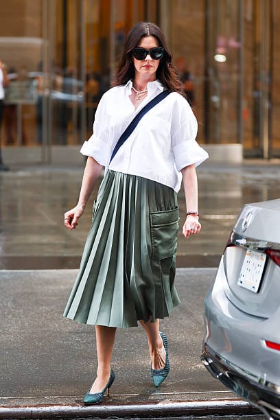 NEW YORK, NEW YORK – JULY 28: Anne Hathaway is seen on the set of “Devil Wears Prada II” in Midtown on July 28, 2025 in New York City. (Photo by Aeon/GC Images)